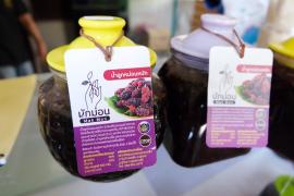 ผลิตภัณฑ์ของวิสาหกิจชุมชนวนเกษตรดงเย็น น้ำลูกหม่อนหมัก มักม่อน ช่วยปรับสมดุลร่างกายมีเอนไซม์ช่วยให้ร่างกายสดชื่น มีกำลังวังชาอุดมด้วยวิตามินบี บี 12 และวิตามินเค ช่วยบำรุงโลหิต บำรุงก