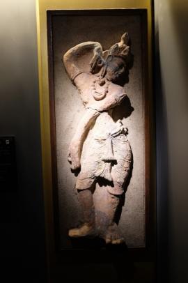 แผ่นดินเผาประติมากรรมนูนต่ำ ทำเป็นรูปบุคคล (บุรุษ) ยืนเอียงสะโพก ขาซ้ายเหยียดตรง ขาขวางอ ปลายเท้าแยกออกทางด้านข้าง แขนขวายกงอขึ้นจีบเป็นวงชิดใบหู และแขนซ้ายเหยียดโค้งพาดกลางลำตัวมือจีบเป็นวงชี้ลงเบื้องล่าง ซึ่งท่าทางดังก
