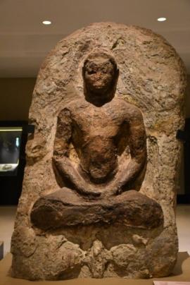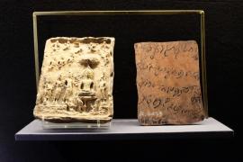 ศิลปะทวารวดีประมาณพุทธศตวรรษที่ 12 หรือราว 1,400 ปีมาแล้ว ลักษณะพระพุทธรูปปางปฐมเทศนาแผ่นสลักหินนูนสูงภาพพระพุทธรูปประทับนั่งสมาธิ พระหัตถ์ทั้งสองข้างขวาทับซ้ายบนพระเพลา ด้านล่างตรงกึ่งกลางสลักเป็นภาพวงธรรมจักร มีรูปกวางหมอบด้านข้าง หมายถ