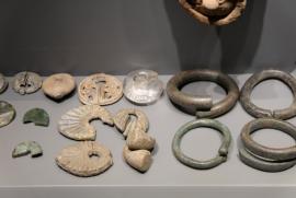 ตุ้มหูสำริดและตะกั่ว จัดแสดงอยู่ที่ พิพิธภัณฑ์สถานแห่งชาติอู่ทอง สุพรรณบุรี เป็นตุ้มหูสำริดและตะกั่วมีทั้งแบบที่มีลักษณะเป็นเส้นกลมคล้ายลวดขนาดใหญ่ขดเป็นวง แบบที่ขดเป็นวงแต่มีลักษณะแบน และในรูปทรงกระบอก มีการตกแต่งลวดลายเพื่อความสวยงาม เป