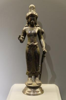 ประติมากรรมสำริดรูปพระโพธิสัตว์ปัทมปาณิ หรือพระโพธิสัตว์อวโลกิเตศวรสูงประมาณ ๒๓.๕ เซนติเมตร เกล้าพระเกศาทรงสูงทรงชฎามงกุฎ มีพระพุทธรูปนั่งปางสมาธิ ซึ่งหมายถึง พระธยานิพุทธเจ้าอมิตาภะ ประทับอยู่ที่ด้านหน้ามวยผม พระหัตถ์ขวาทรงถืออักษมาลา (ล