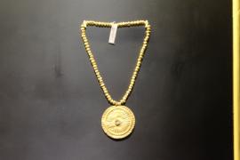 ศิลปะทวารวดีประมาณพุทธศตวรรษที่ 12 หรือราว 1,400 ปีมาแล้ว ลักษณะเครื่องประดับทองคำลูกปัดเป็นทองคำขนาดเล็กรูปทรงกลมพร้อมจี้ทองคำฝังพลอย ตัวจี้เป็นรูปวงกลมมีรัศมีโดยรอบขอบทำเป็นเม็ดลายไข่ปลา ตรงกลางมีพลอยสีขาวประดับ ลูกปัดที่พบมีทั้งทำจากหิ