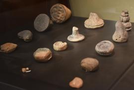 ตราดินเผารูปสัญลักษณ์ทางศาสนาประกอบอักษรโบราณ พบที่เมืองโบราณอู่ทอง อำเภออู่ทอง จังหวัดสุพรรณบุรี จัดแสดง ณ ห้องบรรพชนคนอู่ทอง พิพิธภัณฑสถานแห่งชาติ อู่ทอง ตราดินเผา คือ โบราณวัตถุที่มีรูปรอยนูนขึ้นจากพื้นผิวในลักษณะนูนต่ำ เป็นรอยถูกประทั