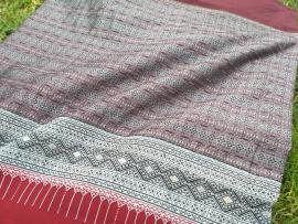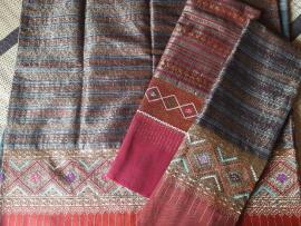 ซิ่นตีนจกเมืองน่าน ตัวซิ่น ลายป้องยกลายหย่อมตีนหมา ตีนจกลายนกน้อย ลายประกอบอุ้งตีนหมี ทอด้วยไหมประดิษฐ์ ยกลายดิ้นเงิน