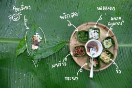 ปกติเมี่ยงคำใบห่อ เราจะเห็นได้ว่าเราใช้ใบผักแคบ้าน ในการเป็นใบหลักในการห่อเมี่ยงคำ แต่ในพื้นที่ชุมชนบ่อสวก เราใช้ใบเมี้ยง ใบเมี้ยงชาป่ามักให้ความสัมผัสอีกหนึ่งรสชาติ กลิ่นหอมเครื่องเมี่ยงคำ ผสมกับใบเมี้ยงกรอบๆ สดๆ เสน่ห์ของเมี่ยงคำยังคื