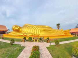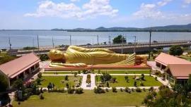 พระนอนแหลมพ้อภายในวัดเป็นพระพุทธรูปปางปรินิพพานที่ใหญ่ที่สุดในประเทศไทย พระนอนแหลมพ้อ ประดิษฐานบนฐานที่ไม่สูงมากนักอยู่ใกล้เชิงสะพานติณสูลานนท์ฝั่งเกาะยอ พระพุทธรูปปางปรินิพานนี้เป็นสถาปัตยกรรมใหม่ที่สร้างขึ้นเมื่อปี พ.ศ. ๒๕๓๗ องค์พระนอนวัดแหลมพ้อ เป็นชื่อเรียกของพระพุทธรูปลักษณะบรรทม (นอน) ตะแคงเบื้องขวา หลับพระเนตร พระเศียรหนุนพระเขนย (หมอน) พระหัตถ์ซ้ายทอดทาบไปตามพระวรกาย พระหัตถ์ขวาวางหงายอยู่ข้างพระเขนย พระบาทซ้ายทับซ้อนพระบาทขวา ส่วนของพระบาทจะมีลวดลายภาพศิลปะของภาพมงคล ๑๐๘ ประการที่สวยงาม