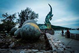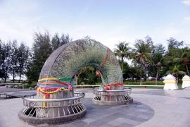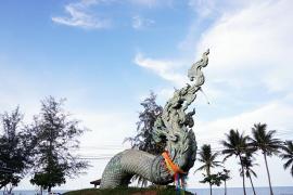 ประติมากรรมพญานาคพ่นน้ำ ถือเป็นสัญลักษณ์หนึ่งของจังหวัดสงขลา เป็นโครงการที่เทศบาลนครสงขลา สรรค์สร้างขึ้นเพื่อ ปรับปรุงภูมิทัศน์บริเวณ ชายหาดสมิหลาให้เป็นสถานที่พักผ่อนของ นักท่องเที่ยวและชาวสงขลา โดยนำเอา คติความเชื่อเกี่ยวกับ พญานาคที่เชื่อว่า “พญานาค” เป็นสัญลักษณ์ของการ กำเนิดน้ำและความอุดมสมบูรณ์ ชาวใต้จึงนับถือพญานาคเป็น สิ่งศักดิ์สิทธิ์ และกราบไหว้ขอพร เพื่อเป็นสิริมงคลแก่ชีวิต นับ เป็นแหล่งการเรียนรู้ทาง วัฒนธรรมแห่งใหม่ที่เกิดขึ้นของ ชาวสงขลา ประติมากรรมพญานาคพ่นน้ำ เป็นสัญลักษณ์หนึ่งของ จังหวัดสงขลา มีลักษณะแบบลอยตัว สามารถมองเห็นได้รอบด้านเนื้อ วัตถุเป็นโลหะทองเหลืองรมสนิมเขียว ออกแบบ โดย อาจารย์มนตรี สังข์มุสิกานนท์ (รองอธิการบดีมหาวิทยาลัยทักษิณคนปัจจุบัน) มีการสร้างขึ้นเป็น 3 ส่วน คือ ส่วนที่หนึ่ง หัวพญานาค ตั้งอยู่บริเวณสวนสองทะเล ปลายแหลมสนอ่อน มีขนาดเส้นผ่าศูนย์กลาง ของลำตัว 1.20 เมตร ความสูงจากฐานลำตัวจนถึงปลายยอดสุด ประมาณ 9 เมตร พ่นน้ำลงสู่ปากอ่าวทะเลสาบสงขลา ส่วนที่สอง สะดือพญานาค ตั้งอยู่บริเวณลานชมดาว สนามสระบัว แหลมสมิหลา ขนาดเส้นผ่าศูนย์กลางของลำตัว 1.20 เมตร ความยาว 5.00 เมตร ความสูง 2.50 เมตร ลักษณะลำตัวโค้งครึ่งวงกลม เพื่อให้นักท่องเที่ยวได้ลอด ใต้สะดือพญานาคให้เกิดความเป็นสิริมงคล แก่ตนเอง ส่วนที่สาม หางพญานาค ตั้งอยู่บริเวณชายหาดสมิหลา ริมถนนสะเดา (หลังสนามกอล์ฟ) ขนาดเส้นผ่าศูนย์กลาง 1.20 เมตร ความยาว 4.00 เมตร ความสูง 4.50 เมตร ปัจจุบันประติมากรรมพญานาคพ่นน้ำได้รับความนิยมจากนักท่องเที่ยวทั้งชาวไทย และชาวต่างประเทศที่เข้ามาเยี่ยมเยือน จังหวัดสงขลา