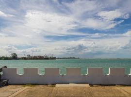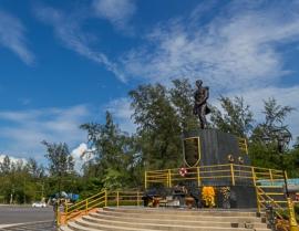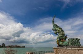 สวนสองทะเลเป็นสวนสาธารณะที่สวยงาม ตั้งอยู่ระหว่างท่าแพขนานยนต์สงขลา และศาลกรมหลวงชุมพรเขตอุดมศักดิ์(อย่าลืมกราบไหว้เพื่อความเป็นศิริมงคล) นอกจากนั้นยังพิเศษเพราะอยู่ระหว่างทะเลสาบสงขลาและทะเลฝั่งอ่าวไทย ที่สวนสองทะเลนี้มีต้นสนให้ความร่มรื่น ลมพัดเย็นสบายทั้งวัน และมีประติมากรรมรูปปั้นพญานาคส่วนหัว สร้างจากโลหะรมสนิมสีเขียว สูงเกือบ 10 เมตรดูยิ่งใหญ่น่าเกรงขาม ซึ่งพญานาคจะพ่นน้ำตั้งแต่เวลา 8 โมงเช้าของทุกวัน เป็นสัญลักษณ์ของความรุ่งเรืองและอุดมสมบูรณ์นั่นเอง ถ้าขับรถเลาะชายหาดมาตั้งแต่หาดสมิหลา หาดชลาทัศน์ ก่อนถึงสวนสองทะเลก็จะเห็นหางและลำตัวพญานาคครบทั้ง 3 ส่วน เป็นกิจกรรมตามล่าแลนด์มาร์คระยะทางยาว 4 กิโลเมตรที่น่าทำอีกอย่างเมื่อมาเยือนอำเภอเมืองสงขลา