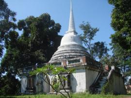 เจดีย์ทรงลังกาวัดท้ายยอหรือทรงระฆัง อายุประมาณ ๒๔๐ ปี ตั้งอยู่บนเขาเพหาร (วิหาร) น่าจะสร้างขึ้นในสมัยรัชกาลที่ ๔ เป็นเจดีย์ทรงกลมตั้งอยู่บนยอดเขาวิหารตรงบริเวณหลังวัดท้ายยอ ฐานบันไดขึ้นลง ๒ ข้าง สันนิษฐานกันว่าบนยอดเขาแต่เดิมนั้นเป็นที่ตั้งของพระอุโบสถเก่าต่อมาช่วงกลางพุทธศตวรรษที่ ๒๕ พระอุโบสถมีสภาพชำรุดทรุดโทรม จึงได้มีการรื้อถอนอุโบสถและทำการก่อสร้างพระเจดีย์ครอบทับ ลักษณะเป็นเจดีย์ก่ออิฐถือปูนทรงลังกา ก่อฐานสี่เหลี่ยมขนาดกว้างประมาณ ๙ เมตร ยาวประมาณ ๑๑ เมตร มีลานประทักษิณ ระเบียงลูกกรงกรุด้วยกระเบื้องปรุลายจีน มีการตกแต่งรอบ ๆ ฐานด้วยลายปูนปั้นที่สวยงาม ด้านนอกมียักษ์ ๒ ตน เฝ้าองค์เจดีย์ตามคตินิยมของชาวบ้านยักษ์ ๒ ตนนั้นเรียกว่าพ่อแก่ยักษ์ มีเรื่องเล่าต่อมาอย่างมุขปาฐกว่านอกจากเฝ้าองค์เจดีย์และพระพุทธองค์แล้ว ยังคอยดูแลช่วยเหลือความเป็นอยู่ของชาวเกาะยอให้มีความสุขสบาย ตลอดจนการประกอบอาชีพให้สำเร็จผล เช่น