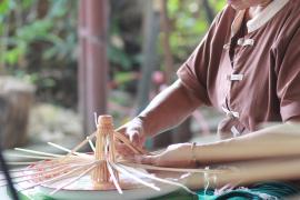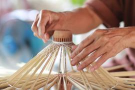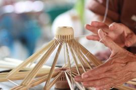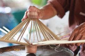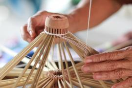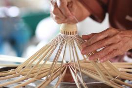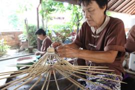 ขั้นตอนการร้อยด้ายประกอบโครงร่ม จะร้อยประกอบโดยใช้ด้ายไนลอน เพราะเป็นด้ายที่มีความเหนี่ยวและทนทาน ไม่ขาดง่าย ร้อยประกอบซี่ค้ำเข้ากับตุ้ม และซี่กลอนเข้ากับหัวร่ม ตามรอยที่ได้เจาะไว้ตอนเหลาซี่ไม้ เสร็จแล้วนำทั้งสองส่วนมาร้อยประกอบเข้ากัน โดยซี่กลอนจะอยู่ด้านบนส่วนซี่ค้ำอยู่ด้านล่าง ขั้นตอนการสนด้ายเป็นลวดลายต่างๆใต้ร่ม จะร้อยโดยใช้ไหมประดิษฐ์หลากสี สนด้ายเข้าตามรูที่เจาะไว้ตามซี่ค้ำและซี่กลอนเป็นลวดลายต่างๆ ตามรูปแบบของร่มแต่ละขนาดแต่ละประเภท