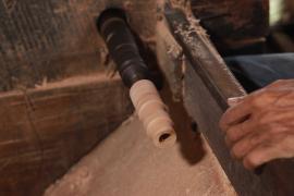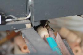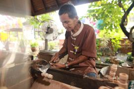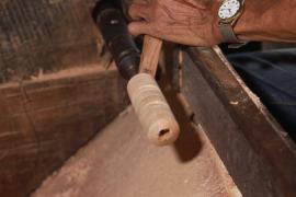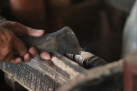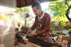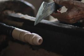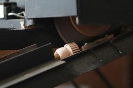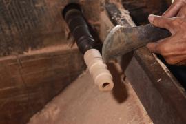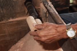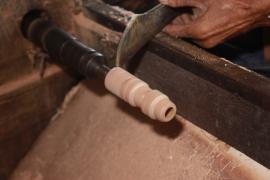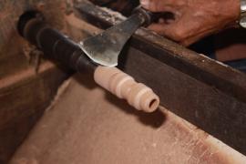 การกลึงหัว, ตุ้มและจิก(ยอด)ร่ม เริ่มจากการนำไม้กระท้อนที่ถูกตัดมาเป็นแท่งยาวประมาณ 12 นิ้ว มาตัดให้เป็นทรงกลม ใช้สว่านเจาะรูเป็นวงกลมตรงกลางแท่งไม้ แล้วนำไปสอดเข้าเครื่องหมุนมอเตอร์ จากนั้นใช้มีดกลึง กลึงแบ่งท่อนไม้ออกเป็นสามส่วนเท่าๆกัน และตัดแบ่งท่อนไม้ตามรอยที่กลึงไว้ ส่วนหัวร่มใช้เครื่องใบมีดมอเตอร์แฉกส่วนบนเป็นซี่ๆ สำหรับยึดซี่กลอนร่ม ส่วนตุ้มร่มจะกลึงให้มีลักษณะส่วนล่างคล้ายลูกตุ้มไว้สำหรับยึดม้าร่ม (ตัวล็อค) และใช้เครื่องใบมีดมอเตอร์แฉกส่วนบนเป็นซี่สำหรับยึดซี่ค้ำ ส่วนจิกร่ม (ยอดร่ม) เป็นส่วนที่มีลักษณะแตกต่างกันออกไปตามประเภทของร่ม โดยส่วนใหญ่จะใช้ไม้มะม่วงที่มีเนื้ออ่อนกว่าไม้กระท้อนมากลึงเป็นจิก (ยอด)ในลักษณะต่างๆ เช่น จิกทรงคล้ายพระธาตุ