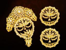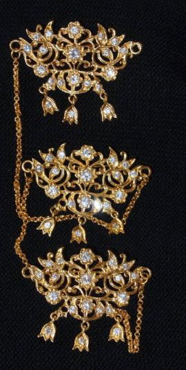 เป็นเข็มกลัดชุด 3 ตัวที่มีสายคล้องเชื่อมต่อกัน ใช้ติดเสื้อแทนกระดุม หรือตกแต่งชุดให้สวยเด่นขึ้น นิยมใช้แต่งกับชุดย่าหยา หรือชุดเคบาย่า มีทั้งลวดลายดอกไม้ เถาวัลย์ หรือเป็นโบว์ ติดเสื้อแล้วดูงามอ่อนช้อย