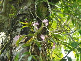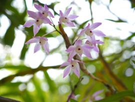 ประวัติการค้นพบ: ถูกตั้งชื่อครั้งแรกโดย Heinrich Gustav Reichenbach (1824-1889) นักพฤกษศาสตร์ชาวเยอรมัน โดยตีพิมพ์ลงในวารสาร Gardeners' Chronicle, new series ฉบับที่ 25 ในปี 1890 ที่มาชื่อไทย: - ลักษณะทางพฤกษศาสตร์: กล้วยไม้อิงอาศัย ลำต้นรูปทรงกระบอก โคนเรียว ยาว 20-30 ซม. ห้อยลง ใบ คล้ายใบหญ้า กว้าง 0.7 ซม. ยาว 5-7 ซม. ดอก ออกเดี่ยวหรือออกเป็นช่อแขนงสั้น ๆ ตามบริเวณใกล้ปลายยอด กลีบเลี้ยงเเละกลีบดอกสีชมพูแกมม่วง ปลายกลีบสีเข้ม โคนกลีบสีจาง กลีบปากสีขาว มีเเต้มสีม่วงแกมเเดงที่โคนกลีบ ขอบกลีบสีชมพูแกมม่วง ฝาครอบกลุ่มเรณูสีม่วงเข้ม ดอกบานเต็มที่กว้าง 1.5-2 ซม. นิเวศวิทยา: พบตามป่าดิบทางภาคตะวันออก ออกดอกช่วงเดือนมีนาคมถึงเดือนพฤษภาคม การกระจายพันธุ์: จีนตอนใต้ และเอเชียตะวันออกเฉียงใต้ ข้อมูลชีววิทยาอื่นๆ: - สถานภาพทางการอนุรักษ์: - เอกสารอ้างอิง: http://www.qsbg.org/Database/Botanic_Book%20full%20option/search_detail.asp?botanic_id=1303