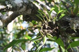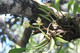 ประวัติการค้นพบ: ถูกตั้งชื่อโดย François Gagnepain นักพฤกษศาสตร์ชาวฝรั่งเศส ตีพิมพ์ในวารสาร Bulletin du Muséum National d’Histoire Naturelle ในปี ค.ศ. 1950 ที่มาชื่อไทย: - ลักษณะทางพฤกษศาสตร์: ลำลูกกล้วยสีเขียวอ่อน รูปไข่แกมรูปขอบขนาน ยาว 5-8 เซนติเมตร ใบมี 2 ใบ รูปใบหอก กว้าง 3-5 เซนติเมตร ยาว 20-25 เซนติเมตร ปลายแหลม แผ่นใบหนามีเส้นใบ ตามยาว 3 เส้น ช่อดอกแบบช่อกระจะ ออกที่ฐานลำลูกกล้วย ก้านช่อดอกยาว 3-4 เซนติเมตร โคนก้านช่อมีการซ้อนทับกัน แต่ละช่อมี 2-5 ดอก กลีบเลี้ยงและกลีบ ดอกด้านข้างสีครีม กลีบเลี้ยงทั้ง 3 กลีบ รูปใบหอก กว้างประมาณ 8 มิลลิเมตร ยาวประมาณ 2 เซนติเมตร กลีบดอกด้านข้างรูปแถบกว้างประมาณ 1.5 มิลลิเมตร ยาวเท่า ๆ กับกลีบเลี้ยงหรือสั้นกว่าเล็กน้อย แผ่กางออกปลายขึ้น กลีบปากสีขาว ยาวประมาณ 1.7 เซนติเมตร มี 3 แฉก บริเวณคอกลีบปากและขอบหูกลีบปากมีแถบสีน้ำตาล แถบตรงคอกลีบปากมีลักษณะเป็นรูปตัววาย บริเวณกลางกลีบมีสันตามยาวชัดเจน 3 สัน เส้าเกสรสีเหลือง นิเวศวิทยา: กล้วยไม้อิงอาศัย เจริญได้บนหิน บนในป่าดิบเขาตามที่โล่งแจ้งแสงรำไร ช่วงออกดอกเดือนมกราคมถึงเดือนกุมภาพันธ์ การกระจายพันธุ์: กล้วยไม้ถิ่นเดียวที่พบเฉพาะในประเทศไทย ข้อมูลชีววิทยาอื่น ๆ: - สถานภาพทางการอนุรักษ์: - เอกสารอ้างอิง: พืชอนุรักษ์ในบัญชีไซเตส (CITES) กล้วยไม้ป่า ในผืนป่าตะวันออก ตอนที่ 1