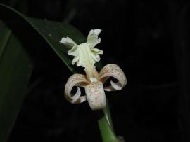 ประวัติการค้นพบ: ถูกค้นพบครั้งแรกโดย Carl(Karl) Ludwig von Blume (1796-1862) นักพฤกษศาสตร์ชาวเยอรมัน-ดัตช์ ต่อมา Alex Drum Hawkes (1927-1977) นักพฤกษศาสตร์ชาวอเมริกัน มาเปลี่ยนชื่อเป็น Flickingeria fimbriata ตีพิมพ์ที่วารสาร Orchid Weekly ในปี 1961 ที่มาชื่อไทย: - ลักษณะทางพฤกษศาสตร์: ลำลูกกล้วยคล้ายทรงกระบอกแคบ ตั้งตรง ปล้องด้านล่างปลายคอด ใบเดี่ยว รูปขอบขนาน ดอกมักออกเดี่ยวตามซอกใบ โคนใบติดกับลำลูกกล้วย ดอกสีขาวนวล มีจุดประสีชมพูอมเเดงกระจายทั่วไป กลีบเลี้ยงกางออก กลีบเลี้ยงบนรูปขอบขนานถึงรูปรี กลีบเลี้ยงข้างโคนเชื่อมติดกันยื่นยาวออกกคล้ายเดือย กลีบดอกรูปขอบขนานแกมรูปไข่แคบ กลีบปากสีนวล กลางกลีบมีสัน 3 สัน ขอบกลีบพลิ้ว ปลายแยกเป็นแฉกกว้าง กางออก ขอบแฉกพลิ้ว [1] นิเวศวิทยา: ดอกบานเดือนมีนาคมถึงเดือนพฤษภาคม พบตามป่าดิบแล้ง ทางภาคตะวันออก ภาคกลาง ภาคตะวันออกเฉียงใต้ และภาคใต้ [1] การกระจายพันธุ์: จีน อินเดีย เนปาล หมู่เกาะอันดามัน หมู่เกาะนิโคบาร์ มาเลเซีย ไทย ลาว เวียดนาม เกาะบอร์เนียว เกาะสุมาตรา เกาะชวา ซุลาเวซี หมู่เกาะซุนดาน้อย ฟิลิปปินส์ [2] ข้อมูลชีววิทยาอื่นๆ: - สถานภาพทางการอนุรักษ์: - เอกสารอ้างอิง: [1] หนังสือบัญชีรายการทรัพย์สินชีวภาพกล้วยไม้ไทย ส่วนที่ 2 https://bedolib.bedo.or.th/book/131 [2] https://www.orchidspecies.com/flickfimbriata.htm