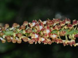 ประวัติการค้นพบ: ถูกค้นพบครั้งแรกโดย Carl(Karl) Ludwig von Blume (1796-1862) นักพฤกษศาสตร์ชาวเยอรมัน-ดัตช์ ต่อมา Johannes Jacobus Smith (1867-1947) นักพฤกษศาสตร์ชาวเบลเยียม เปลี่ยนชื่อเป็น Robiquetia spathulata ตีพิมพ์ในวารสาร Natuurkundig Tijdschrift voor Nederlandsch-Indië. ในปี 1912 ที่มาชื่อไทย: - ลักษณะทางพฤกษศาสตร์: ลำต้นรูปทรงกระบอกห้อยลง ใบรูปแถบ ขนาด 2x10 เซนติเมตร หนาและแข็ง มีหลายใบ ปลายใบเว้าบุ๋ม ช่อดอกห้อยลง มีดอกจำนวนมาก เรียงแน่น ดอกสีเหลืองและแดง ขนาด 0.8 เซนติเมตร กลีบเลี้ยงรูปรีกว้าง ปลาบกลีบมน กลีบดอกรูปขอบขนาน ปลายกลีบมน กลีบปากอวบหนา สีเหลืองครีม มีเดือยดอกขนาดใหญ่ รูปทรงกระบอก ปลายมน นิเวศวิทยา: กล้วยไม้อิงอาศัย พบในป่าดิบแล้ง ป่าดิบชื้น และป่าพรุตามที่ร่มรำไร ช่วงออกดอกเดือนพฤษภาคมถึงเดือนมิถุนายน การกระจายพันธุ์: อินเดีย (สิกขิม) พม่า ไทย ลาว กัมพูชา เวียดนาม มาเลเซีย อินโดนีเซีย ข้อมูลชีววิทยาอื่น ๆ: - สถานภาพทางการอนุรักษ์: พืชอนุรักษ์บัญชีที่ 2 ของอนุสัญญาไซเตส เอกสารอ้างอิง: พืชอนุรักษ์ในบัญชีไซเตส (CITES) กล้วยไม้ป่า ในผืนป่าตะวันออก ตอนที่ 1