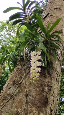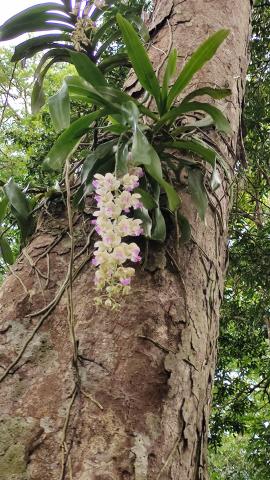 ประวัติการค้นพบ: ถูกค้นพบตั้งชื่อโดย John Lindley (1799-1865) นักพฤกษศาสตร์ชาวเยอรมัน และ Joseph Paxton (1803-1865) นักพฤกษศาสตร์ชาวอังกฤษ ตีพิมพ์ทีลงในวารสาร Flora Garden V. 2 ในปี 1851 ที่มาชื่อไทย: - ลักษณะทางพฤกษศาสตร์: ลำต้นยาวและห้อยลง ใบูปแถบ ขนาด 3x20 เซนติเมตร เรียงห่างกัน ปลายใบเว้า ช่อดอกห้อยลง มักมีมากกว่า 1 ข่อ ดอกขนาด 2.5 เซนติเมตร กลีบเลี้ยงบนรูปรีกว้างจนเกือบกลม ปลายกลีบแหลม กลีบเลี้ยงคู่ข้างรูปครึ่งวงกลมและเบี้ยว ปลายกลีบแหลมจนถึงเป็นติ่งแหลม โคนกลีบเชื่อมกับคางเส้าเกสร กลีบดอกรูปรี ปลายกลีบหยักเป็นฟันไม่สม่ำเสมอ ปลายกลีบมนสีม่วง กลีบปากแผ่เป็น 3 แฉก แฉกกลางมขนาดใหญ่รูปครึ่งวงกลม ปลายเว้า กลางกลีบคอด หูกลีบปากรูปเคียวขนาดใหญ่ ปลายมน ดอกมีกลิ่นหอม นิเวศวิทยา: กล้วยไม้อิงอาศัย พบในป่าเบญจพรรณ ป่าเต็งรัง พบบ้างในป่าดิบเขา และป่าดิบแล้งตามที่โล่งแจ้ง แสงแดดจัดและแสงแดดรำไร พบได้ทุกภูมิภาคของไทย ช่วงออกดอกเดือนพฤษภาคมถึงเดือนมิถุนายน การกระจายพันธุ์: อินเดีย พม่า ลาว กัมพูชา เวียดนาม ไทย ข้อมูลชีววิทยาอื่น ๆ: - สถานภาพทางการอนุรักษ์: พืชอนุรักษ์บัญชีที่ 2 ของอนุสัญญาไซเตส เอกสารอ้างอิง: พืชอนุรักษ์ในบัญชีไซเตส (CITES) กล้วยไม้ป่า ในผืนป่าตะวันออก ตอนที่ 1