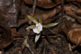 ประวัติการค้นพบ: เป็นกล้วยไม้ดินที่พบครั้งแรกที่อุทยานแห่งชาติเขาใหญ่ จ.นครราชสีมา โดยนักพฤกษศาสตร์ชาวไทยจากกรมอุทยานแห่งชาติ สัตว์ป่า และพันธุ์พืช สวนพฤกษศาสตร์สมเด็จพระนางเจ้าสิริกิติ์ และนักพฤกษศาสตร์ชาวฮ่องกง ตีพิมพ์ในวารสาร Kew bulletin 68:331 (2013) ตัวอย่างต้นแบบถูกเก็บไว้ที่ หอพรรณไม้ กรมอุทยานแห่งชาติ สัตว์ป่า และพันธุ์พืช (ฺBKF Herbarium) ที่มาชื่อไทย: เนื่องจากพบในพื้นที่ที่มีความชุ่มชื้นสูงและเย็น จึงเป็นที่มาของว่านแผ่นดินเย็นเขาใหญ่ ลักษณะทางพฤกษศาสตร์: กล้วยไม้ดิน มีลำต้นใต้ดิน ใบรูปหัวใจ ปลายใบแหลม โดนใบเว้าลึก เจริญบนดินมีสีเขียวหรือม่วง ผิวใบเกลี้ยง มีเเส้นใบประมาณ 5-7 เส้น ช่อดอกยาว 5-7 ซม. มีใบประดับรูปขอบขนานปลายแหลม ดอกตั้งตรง กลีบเลี้ยงและกลีบดอกสีน้ำตาล รูปไข่กลับ หรือรูปไข่ กลีบปากสีขาวหรือสีครีม มีสีเหลืองหรือเขียวบริเวณกลางกลีบปาก มีจุดสีม่วง นิเวศวิทยา: พบตามป่าดิบชื้น เจริญบนดินที่มีซากพืชทับถม มี 1 ใบ ใบและดอกออกคนละช่วงเวลาไม่พร้อมกัน สูงจากระดับน้ำทะเล 700-800 ม. ออกดอกเดือนมีนาคม-กันยายน การกระจายพันธุ์: พบในประเทศไทย (อุทยานแห่งชาติเขาใหญ่) ข้อมูลชีววิทยาอื่น ๆ: - สถานภาพทางการอนุรักษ์: พืชถิ่นเดียวในประเทศไทย (Endermic) เอกสารอ้างอิง: -