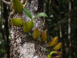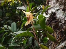 ประวัติการค้นพบ: กล้วยไม้ชนิดนี้ถูกตั้งชื่อโดยนักพฤกษศาสตร์ชาวเยอรมัน ชื่อ Heinrich Gustav Reichenbach ในปี ค.ศ. 1864 ที่มาชื่อไทย: ลักษณะทั่วไป ลำลูกกล้วยมีผิวมัน ใบมัน และดอกผิวมันเช่นกัน จึงถูกเรียกว่าเอื้องเทียนหรือเอื้องมัน ดอกค่อนข้างมี ขนาดใหญ่ ช่อดอกออกจากโคนต้น มีสามถึงห้าดอก ใบประดับเป็นกาบมีขนาดยาวพอ ๆ กับความ ยาวของกลีบดอก มักมีกลิ่นหอมอ่อน ๆ ที่ปากมักมีแต้มสีสดใสลวดลายต่าง ๆ กันตามชนิด ลักษณะทางพฤกษศาสตร์: ลำลูกกล้วย 1 ลำ มีใบอยู่อยู่บริเวณปลายลำลูกกล้วย ใบรูปหอกปลายแหลมเล็กน้อยขอบใบบิดเป็นคลื่นเล็กน้อย โคนใบแคบสอบบริเวณใกล้ฐาน ช่อดอกมีความยาวประมาณ 4 ซม. (อาจยาวได้ถึง 10 ซม.) ใน 1 ช่อดอก มีดอกจำนวน 1-2 ดอก กลีบเลี้ยงรูปหอก กลีบดอกเป็นแถบปลายเรียวแหลม กลีบปากบริเวณโคนแผ่เป็นถุง บนแผ่นกลีบปากมีปุ่มเป็นแถบ 2 แถบขนานกันตามแนวยาวของกลีบปาก นิเวศวิทยา: ป่าผลัดใบและป่าไม่ผลัดใบทุกภูมิภาค การกระจายพันธุ์: มีรายงานพบในประเทศไทย และพม่า ข้อมูลชีววิทยาอื่นๆ: สถานภาพทางการอนุรักษ์: เอกสารอ้างอิง: Orchidspecies.com การจำแนกพันธุ์และการประเมินความสัมพันธ์ทางพันธุกรรมของกล้วยไม้สกุลเอื้องเทียนด้วยเครื่องหมายดีเอ็นเอ, IDENTIFICATION AND ASSESSMENT OF GENETIC RELATIONSHIP AMONG COELOGYNE USING DNA MARKERS (tu.ac.th) https://www.orchids.org/grexes/coelogyne-triplicatula