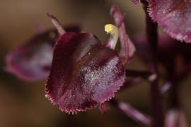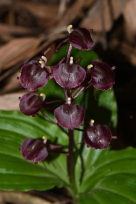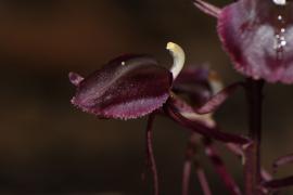 ประวัติการค้นพบ: มีการรายงานพืชชนิดนี้ครั้งแรกในวารสาร Journal of the Straits Branch of the Royal Asiatic Society ปี ค.ศ. 1903 โดย นักพฤกษศาสตร์ชาวอังกฤษ Henry Nicholas Ridley ที่มาชื่อไทย: - ลักษณะทางพฤกษศาสตร์: กล้วยไม้ดิน ลำลูกกล้วยรูปกระสวยแคบ มีกาบหุ้มลำลูกกล้วย ใบมี 3-4 ใบ ต่อลำ รูปรี ช่อดอกตั้งขึ้น มีดอกมากถึง 12 ดอก ต่อช่อ ดอกสีม่วงเข้มออกหม่น กลีบเลี้ยงบนรูปขอบขนานจนถึงรูปหอก กลีบเลี้ยงข้างรูปหอกเบี้ยว กลีบดอกเป็นเส้น กลีบปากรูปไข่กลับจนถึงรูปหัวใจกลับ ขอบกลีบปากส่วนปลายหยักคล้ายจักรฟันเลื่อย โคนกลีบปากมีปุ่มเนื้อเยื่อเป็นสันอยู่บริเวณโคนกลีบทั้งสองข้าง นิเวศวิทยา: พบขึ้นตามที่ชื้นสันเขาลาดเอียง และมีมอสปกคลุม ออกดอกในเดือนพฤษภาคม-กรกฎาคม การกระจายพันธุ์: ประเทศอินเดีย หมู่เกาะในทะเลอันดามัน เกาะนิโคบา ประเทศไทย เวียดนาม คาบสมุทรมาเลเซีย และเกาะสุมาตรา ข้อมูลชีววิทยาอื่นๆ: - สถานภาพทางการอนุรักษ์: - เอกสารอ้างอิง: [1] Sumathi, R., Jayanthi, J. & Karthigeyan, K. (2011). Liparis atrosanguinea Ridl. (Orchidaceae), a new Orchid addition to India from Andaman & Nicobar islands Taiwania 56: 257-260.