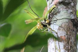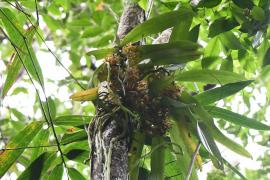 ประวัติการค้นพบ: ถูกตั้งชื่อและค้นพบครั้งแรก ในสกุล Aerides โดย Francis Buchanan-Hamilton (1762-1829) นักพฤกษศาสตร์ชาวสกอตแลนต์ ร่วมกับ James Edward Smith (1759-1828) นักพฤษกศาสตร์ชาวอังกฤษ มีการเปลี่ยนสกุลและชื่อหลาย จนครั้งสุดท้าย David Don นักพฤกษศาสตร์ชาวสกอตแลนต์ เปลี่ยนสกุลเป็น Gastrochilus ตีพิมพ์ในวารสาร Prodromus Florae Nepalensis, sive Enumeratio Vegetabilium ปี ค.ศ. 1825 ที่มาชื่อไทย: - ลักษณะทางพฤกษศาสตร์: ต้น รูปกลมและยาว เส้นผ่านศูนย์กลาง 4.8-5 มิลลิเมตร ยาว 5-10 เซนติเมตร ราก จำนวนไม่มาก เส้นผ่านศูนย์กลางประมาณ 3.5 มิลลิเมตร ยาวประมาณ 25 เซนติเมตรออกบริเวณโคนต้น ใบ จำนวน 3-5 ใบ รูปแถบ กว้างประมาณ 2 เซนติเมตรยาว 12-15 เซนติเมตรปลายหยักเป็น 2 แฉกปลายมนขนาดไม่เท่ากัน ช่อดอก แบบช่อเชิงหลั่น ห้อยลง ยาวประมาณ 3.5-4 เซนติเมตรจำนวน 1-2 ช่อ ก้านและแกนช่อสีเขียวสด เส้นผ่านศูนย์กลางประมาณ 3 มิลลิเมตร ก้านช่อยาวประมาณ 1.5 เซนติเมตรมีเนื้อ ดอกในช่อ 7-10 ดอก ดอก ขนาดประมาณ 1.5 เซนติเมตรกลีบเลี้ยงและกลีบดอกคล้ายกัน สีเขียวแกมเหลือง มีประสีน้ำตาลแดงขนาดใหญ่กระจายห่างทางด้านบน รูปไข่กลับ โคนสอบ ปลายมน ขอบกลีบโค้งเป็นแอ่ง กลีบเลี้ยงบน กว้าง 3-3.5 มิลลิเมตร ยาว 6-6.5 มิลลิเมตร กลีบเลี้ยงข้าง กว้าง 2.5 2.8 มิลลิเมตรยาว 6-6.5 มิลลิเมตร กลีบดอก กว้าง 2.5-2.7 มิลลิเมตร ยาว 5.5-6 มิลลิเมตร กลีบปาก กว้างประมาณ 6 มิลลิเมตร ยาวประมาณ 7 มิลลิเมตร ช่วงโคนเป็นแอ่งกลม ลึกประมาณ 4.5 มิลลิเมตร สีเหลืองมีประสีน้ำตาลแดงทั่วผิวด้านนอก ช่วงปลายเป็นแผ่นรูปสามเหลี่ยม กว้างประมาณ 6 มิลลิเมตร ยาวประมาณ 3.5 มิลลิเมตร ขอบจักชายครุย ด้านบนมีขนสีขาวหนาแน่น บริเวณเนื้อเยื่อนูนตรงกลางกลีบปากมีสีเหลือง เส้าเกสร กว้างประมาณ 3 มิลลิเมตร ยาวประมาณ 2.7 มิลลิเมตร กลุ่มเรณู รูปกลม ขนาดประมาณ 0.5 มิลลิเมตร ก้านรูปแถบบางใส ยาวประมาณ 1.5 มิลลิเมตร แป้นเหนียวรูปรี ยาวประมาณ 0.5 มิลลิเมตร ฝาครอบกลุ่มเรณูรูปไข่ กว้างประมาณ 2 มิลลิเมตร ยาวประมาณ 2.5 มิลลิเมตร ยอดเกสรเพศเมีย เป็นแอ่งรูปกลม อยู่ทางด้านหน้าของเส้าเกสร ก้านดอกและรังไข่ ยาวประมาณ 1.3 เซนติเมตรใบประดับย่อย เป็นเกล็ดเล็ก ๆ สีเขียว รูปสามเหลี่ยม ยาวประมาณ 1 มิลลิเมตร ฝัก ไม่พบ นิเวศวิทยา: พบค่อนข้างมากเกาะบนต้นไม้บริเวณที่มีแสงปานกลาง ที่ความสูงจากระดับน้ำทะเลประมาณ 1,200 เมตร ออกดอกเดือนมกราคม การกระจายพันธุ์: หิมาลัย ธิเบต พม่า จีน มาเลเซีย ลาว เวียดนาม ข้อมูลชีววิทยาอื่น ๆ: - สถานภาพทางการอนุรักษ์: - เอกสารอ้างอิง: อมรรัตน์ บัวคล้าย. 2543. ความหลากหลายของกล้วยไม้บริเวณเขาเขียว อุทยานแห่งชาติเขาใหญ่. วิทยานิพนธ์ปริญญามหาบัณฑิต. ภาควิชาพฤกษศาสตร์ คณะวิทยาศาสตร์ จุฬา