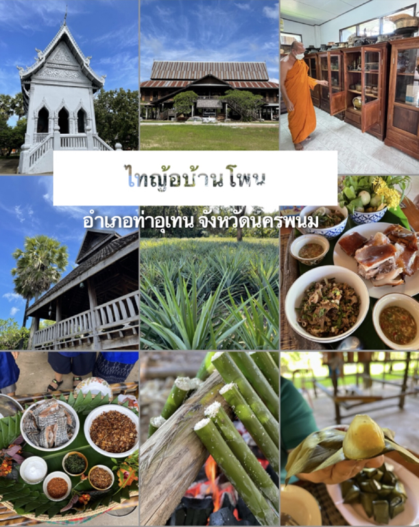 ความเป็นมาชุมชนบ้านโพน เป็นคนไทยย้อ ถิ่นฐานดั้งเดิมของชาวย้อมีผู้ค้นพบว่า เดิมอยู่ แคว้นสิบสองปันนา หรือ ยูนาน ต่อมาชาวย้อบางพวกได้อพยพลงมาตามลำน้ำโขงเพื่อเลือกหาที่ตั้ง บ้านตั้งเมืองที่อุดมสมบรูณ์กว่าที่อยู่เดิมจนในที่สุด ชาวย้อกลุ่มหนึ่งได้พบว่าตรงปากน้ำสงครามริมฝั่งโขง เป็นที่อุดมสมบรูณ์ มีปลาชุกชุม จึงได้จัดตั้งขึ้นที่เมืองหงสา แขวงไชยบุรี สาธารณรัฐประชาธิปไตยประชาชนลาว ส่วนใหญ่ได้อพยพมาตั้งถิ่นฐานใหม่ที่ไชยบุรี ปากน้ำสงคามริมฝั่งแม่น้ำโขง (ตำบลไชยบุรี อำเภอ ท่าอุเทน จังหวัดนครพนมปัจจุบัน) ในสมัยรัชกาลที่ 1 เมื่อ พ.ศ. 2351 ต่อมาเจ้าอนุวงศ์เวียงจันทน์ได้เป็นกบฏต่อกรุงเทพมหานครในสมัยรัชกาลที่ 3 (พ.ศ. 2369) ไทยย้อเมืองไชยบุรีได้ถูกกองทัพเจ้าอนุวงศ์เวียงจันทน์กวาดต้อนให้อพยพข้ามโขง โดยให้ไปตั้งอยู่ที่เมืองปุงลิง ฝั่งซ้ายแม่น้ำโขง (อยู่ในเขตแขวงเมืองคำเกิด เมืองคำม่วน สาธารณรัฐประชาธิปไตยประชาชนลาว) อยู่ระยะหนึ่ง (ชัญญา อภิปาลกุล และ ขลธิชา เจิมพันธุ์. 2552 : 50) ต่อมากองทัพไทย ได้กวาดต้อนให้ไทยย้ออพยพข้ามโขงกลับมาอีกครั้งหนึ่งทรงพระกรุณาโปรดเกล้าฯ ให้ไทยย้อกลุ่มหนึ่งตั้งเมืองขึ้นใหม่ทางฝั่งขวาแม่น้ำโขง ตั้งเป็นเมืองท่าอุเทน เมื่อ พ.ศ. 2373 คือ บริเวณท่าอุเทน จังหวัดนครพนมในปัจจุบัน