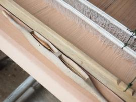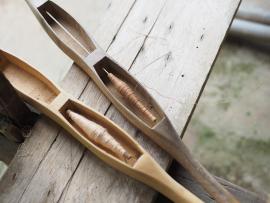 กระสวย คืออุปกรณ์ที่ใช้ในการทอผ้าสำหรับใส่หลอดม้วนเส้นด้ายพุ่งเข้าไปในเส้นยืนที่ขึงอยู่บนกี่หรือหูกทอผ้า เพื่อที่จะให้ด้ายพุ่งสอดนำหลอดเส้นพุ่งในการทอผ้า ส่วนใหญ่กระสวยจะทำด้วยไม้ที่มีน้ำหนัก เช่น ไม้ประดู่ ไม้พะยูง โดยลักษณะของกระสวย มีรูปร่างคล้ายเรือ มีความยาวประมาณ 35-40 เซนติเมตร กว้าง 3 เซนติเมตร ทำส่วนหัวและส่วนท้ายให้เรียว เพื่อสะดวกในการพุ่งเข้าไประหว่างด้ายยืน เมื่อช่างทอผ้ากระทบฟืมให้ด้ายพุ่งชิดกันครั้งหนึ่ง ก็จะพุ่งกระสวยอีกครั้งหนึ่งสลับกันไปเรื่อยๆ จนกว่าจะได้เนื้อผ้าและ ลายตามที่ต้องการ ซึ่งกระสวยนี้เป็นอุปกรณ์ที่กลุ่มทอผ้าและย้อมเปลือกไม้มงคลบ้านโพน ยังคงอนุรักษ์และสืบสานเครื่องมือดั้งเดิมนี้ในการเป็นส่วนหนึ่งในการสร้างสรรค์การทอผ้าของชุมชนอย่างยั่งยืน