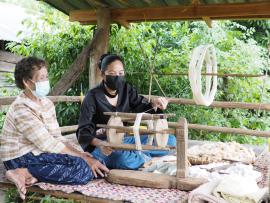 อุปกรณ์กงฝ้าย เป็นอุปกรณ์ที่ใช้สำหรับใส่เส้นด้ายเพื่อเตรียมกรอเส้นด้ายเข้าอัก หรือเพื่อตรวจสอบความเรียบร้อยของเส้นด้าย เช่น เก็บส่วนที่เป็นขุย ปุ่ม ปม ก่อนนำไปใช้งาน กงฝ้ายที่กลุ่มเข็นฝ้ายบ้านโพน อำเภอท่าอุเทน จังหวัดนครพนม ใช้ประกอบด้วย 2 ส่วน คือ กง และหลักตีนกง โดย กง จะมีแกนที่ทำด้วยไม้ไผ่เหลากลม ยาวประมาณ 1 เมตร ตรงปลายแกนทั้งสองข้างจะมีไม้ไผ่เหลาแบนปลายแหลมเสียบไว้ในลักษณะไขว้กันเป็นรูปกากบาทหรือ 4 แฉก ยึดติดกับแกนกลาง มีเชือกผูกโยงระหว่างแฉก ส่วนนี้จะเป็นส่วนรองรับไจด้าย ปลายแกนจะยื่นยาวต่อจากจุดมัดแฉกเล็กน้อยเพื่อสอดเข้ากับหลักตีนกง ในส่วนของ หลักตีนกง จะทำด้วยไม้ มีจำนวน 2 ชิ้น มีฐานยึดเพื่อให้ไม้ตั้งสูงได้ในแนวดิ่ง สูงประมาณ 1 เมตร ที่ปลายหลักจะเจาะรูสำหรับสอดแกนกง ทำให้กงหมุนได้ การวางหลักตีนกงจะวางให้มีระยะห่างพอดีกับกง เพื่อให้หมุนได้สะดวก ซึ่งอุปกรณ์กงฝ้ายนี้ เป็นอุปกรณ์ที่กลุ่มเข็นฝ้ายบ้านโพน ยังคงอนุรักษ์และสืบสานเครื่องมือดั้งเดิมนี้ในการเป็นส่วนหนึ่งในการสร้างสรรค์การทอผ้าของชุมชนอย่างยั่งยืน