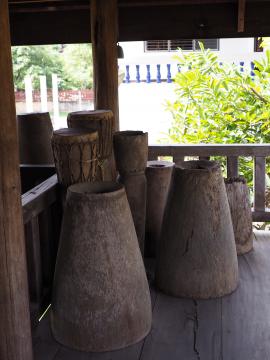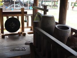 โปง หรือ กะปุง (ระฆังใหญ่ทำด้วยไม้ กระทุ้งด้วยไม้ทำให้เกิดเสียง) ตีบอกเวลาในกิจกรรม ที่เกี่ยวเนื่องกับพระพุทธศาสนา เป็นการสื่อสารระหว่างพระกับชาวบ้าน โปง เป็นเครื่องตีบอกอาณัติสัญญาณของพระสงฆ์ในวัด แทนการตีระฆัง หรือกลอง เพราะเสียงโปงจะดังกังวานกว่าระฆังหรือกลอง โปงทำด้วยไม้เนื้อแข็ง แล้วนำมาขุดให้เป็นโพรงกลวงข้างใน คว่ำด้านที่ขุดเป็นโพรงลงด้านล่าง เจาะด้านข้างเป็นรูทั้งสองข้างเพื่อเป็นรูเสียง หรือรูแพ แล้วเจาะรูด้านบนสำหรับสอดไม้ค้ำโปงกับเสาแขวนไว้ใต้หอระฆัง เวลาตีใช้ไม้ท่อนใหญ่ๆ ลักษณะคล้ายสากกระทุ้งโปงเพื่อให้เกิดเสียง การกระทุ้งโปงภาษาท้องถิ่นอีสานเรียก "ทั่งโปง" กระทุ้งโปงตามช่วงเวลา ดังนี้ เวลาเช้า ก่อนพระบิณฑบาต เพื่อให้ญาติโยมเตรียมตัวตักบาตร, เวลาเย็น เพื่อประโยชน์ให้คนที่หลงป่ากลับมาถูกทิศ, เวลาย่ำค่ำ ในช่วงเข้าพรรษาเพื่อให้พระลงทำวัตรเย็น, เวลายามวิกาล แสดงว่าเกิดเหตุร้ายขึ้นในวัด และแจ้งข่าวสารให้ชาวบ้านได้ทราบว่าทางวัดขอความช่วยเหลือ โปง อยู่ในหอกลองและหอระฆัง ตั้งอยู่ภายในบริเวณวัดคามวาสี เป็นอาคารยกสูง 2 ชั้น ลักษณะก่อสร้างตัวอาคารด้วยโครงสร้างและองค์ประกอบเป็นไม้ทั้งหลัง มีไม้พาดเป็นขื่อสำหรับแขวนโปง, ระฆัง และกลอง มีความโปร่งโล่ง เพราะไม่ได้ก่อฝาผนังทึบตัน โดยอยู่ในเขตพุทธาวาส ใช้แขวนโปง, ระฆัง และกลองสำหรับตีบอกเวลา เพื่อให้พระภิกษุสงฆ์ทราบเวลาสำหรับการประกอบวัตรปฏิบัติต่างๆ โดยพร้อมเพรียงกัน อันได้แก่ การทำวัตรเช้า-เย็น การฉันเพล ฯลฯ