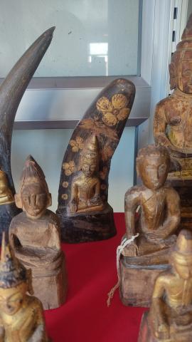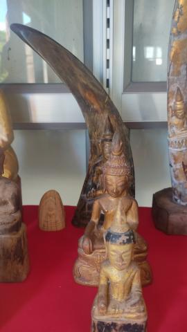 พระพุทธรูปที่ถูกแกะสลักจากเขากระบือ ถูกจัดแสดงอยู่ในพิพิธภัณฑ์ศูนย์วัฒนธรรมไทญ้อ ในวัดคามวาสี