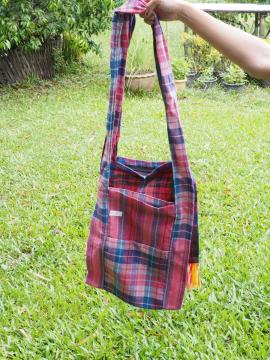 กระเป๋าย่ามจากผ้าฝ้ายลายตารางหมากรุกหรือลายทาง เป็นหนึ่งในผลิตภัณฑ์ที่ต่อยอดมาจากผ้าฝ้ายที่คนในชุมชนมี โดยสามารถใช้ถือหรือสะพายข้างก็ได้ กระเป๋าย่ามจากผ้าฝ้ายนี้มีน้ำหนักเบา พกพาสะดวก เหมาะสำหรับใส่ของทั่วไป หรือใช้เป็นถุงช้อปปิ้งเพื่อลดการใช้พลาสติกก็ได้เช่นกัน