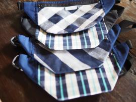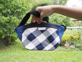 กระเป๋าคาดเอวผ้าฝ้าย เป็นผลิตภัณฑ์ของกลุ่มอาชีพทอผ้าและผ้าย้อมสีเปลือกไม้มงคล โดยมีการนำผ้าฝ้ายพื้นเมืองย้อมด้วยน้ำคราม เรียกว่า “ผ้าย้อมหม้อ” (เหมือนกับผ้าหม้อฮ่อมของทางภาคเหนือ) นำมาออกแบบและตัดเย็บเป็นกระเป๋าคาดเอวผ้าฝ้าย ตัวกระเป๋าทำจากผ้าฝ้ายลายตารางหมากฮอต ด้านหน้าทำสองกระเป๋าซ้อนกัน ด้านหลังทำไว้อีกหนึ่งกระเป๋าเพื่อเก็บของสำคัญไว้ด้านใน ติดซิปยาวทั้งสองด้าน กุ๊นรอบตัวกระเป๋าด้วยผ้ากุ๊นสีดำ สายกระเป๋าผ้าฝ้ายทอสีน้ำเงิน เชื่อมต่อ