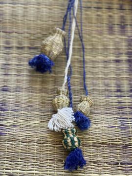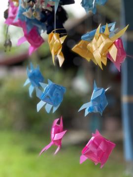 โมบายรูปข้องและปลาตะเพียน เป็นการนำเอาข้องสานจากไม้ไผ่มารวมกับปลาตะเพียนที่ใช้ริบบิ้นมาสานเป็นรูปปลาตะเพียน เพราะปลาตะเพียนเป็นสัญญลักษณ์แห่ง ความอุดมสมบูรณ์