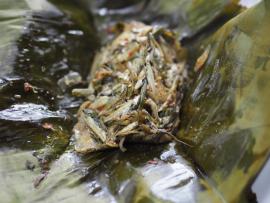 5. นำหมกปลาซิวไปนึ่งโดยใช้เวลา 15 - 20 นาที แล้วนำมาจัดเสิร์ฟคู่กับข้าวเหนียว