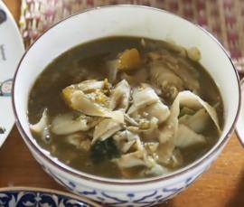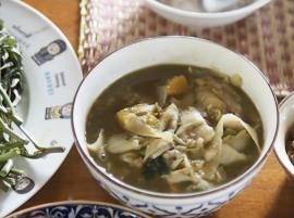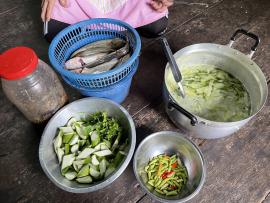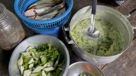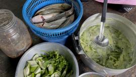 3. นำหน่อไม้ที่ต้มแล้วมาต้มกับน้ำใบหญ้านางและพริกแกง และนำปลาดุกลงต้มในน้ำเดือดจัด