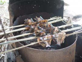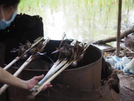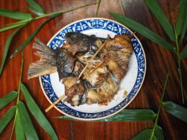 这道烤鱼是塔武泰县的地方菜肴,用泰语应该可以称为什锦草药烤鱼,可以用黑鱼、鲶鱼、巴沙鱼等来烤制,半坡村泰瑶族的人喜欢用湄公河亮背鲇或巴沙鱼来做,配料有红葱、鲜辣椒、干辣椒和香茅等,把它们捣碎拌匀后塞到鱼肚子里,然后再用火炭烘烤,配料的香味会慢慢释放出来,加上鱼肉的鲜甜,实在是太美味了。
