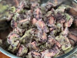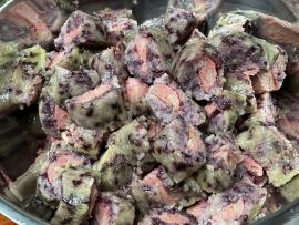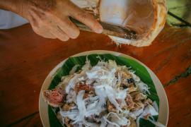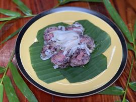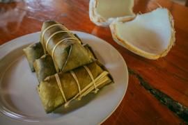 白头米粽是半坡村的特色甜点,泰瑶人经常在各种功德活动中做这种甜点吃。泰瑶人说吃这种甜点的时候,要把米粽切成小块,然后撒上白糖和椰丝,白色的椰丝看起来就像是老人花白的头发,这就是“白头米粽”这个名字的由来,寓意也很吉祥,谁吃了白头米粽,就能长寿,活到“白头”。正因为这个名称寓意吉祥,这里的村民把这道甜点用来接待旅客以及重要的贵宾,而且还保留了这个非文化遗产,让其传承下去。