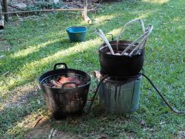 สาธิตการย้อมผ้าจากไม้มงคล เป็นกิจกรรมการท่องเที่ยวชุมชนที่ชาวไทญ้อ บ้านโพนนำมาสาธิตและจัดกิจกรรมให้นักท่องเที่ยวหรือผู้เยี่ยมเยือนเข้ามามีส่วนร่วมในการเรียนรู้วิธีการ สาธิตการย้อมผ้าจากไม้มงคล ซึ่งชาวไทญ้อบ้านโพนจะจัดเตรียมวัตถุดิบและมีปราชญ์ชาวบ้านกลุ่มทอผ้าและย้อมเปลือกไม้มงคลบ้านโพน มาสาธิตและอธิบายวิธีการย้อมผ้าจากไม้มงคลให้นักท่องเที่ยวหรือผู้เยี่ยมเยือนเข้ามาเรียนรู้และทดลองปฏิบัติ โดยย้อมผ้าจากสีไม้ธรรมชาติเพื่อความสวยงามและเป็นสิริมงคลแก่ผู้สวมใส่ ได้แก่ ไม้ราชพฤกษ์ให้สีเหลือง-น้ำตาล, ไม้กันเกา ให้สีเหลืองอ่อน, ไม้มะยมให้สีเหลืองเขียว, ไม้ยอให้สีเหลือง, ไม้ประดู่ ให้สีชมพูม่วง, ต้นสาปเสือ ให้สีเขียวอ่อน, ขมิ้นให้สีเหลือง, ครั่งให้สีม่วงอมน้ำตาล โดยแฝงนัยแห่งความเป็นสิริมงคลตามชื่อไม้มงคลที่นำมาเป็นวัตถุดิบหลักในการย้อมผ้า แปลความได้ว่า 1. ต้นราชพฤกษ์ หรือต้นคูน ค้ำคูณ กตัญญู นำสิ่งดีๆให้ผู้เป็นเจ้าของ 2. ไม้มะยม นิยมชมชอบ 3. ไม้ยอ ยกย่อง สรรเสริญ 4. ไม้ประดู่ แข็งแกร่ง ร่มเย็น และเป็นเป็นการสืบทอดภูมิปัญญาการย้อมสีผ้าเพื่อนำเส้นด้าย ไปใช้ในการทอผ้าย้อมไม้มงคลเป็นผืน นอกจากนี้ ผ้าย้อมสีไม้มงคลของชุมชนบ้านโพน อำเภอท่าอุเทน จังหวัดนครพนม ยังใช้ลักษณะเฉพาะทางธรรมชาติมาใช้อุปลักษณ์บ่งชี้ถึงการสื่อความเป็นสิริมงคลของผ้าอีกทางหนึ่งด้วย