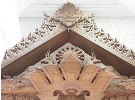 ถัดขึ้นไปด้านบนจากสัญลักษณ์วงล้อธรรมจักรและกวางมอบอยู่ 2 ข้าง จะเป็นการแกะสลักไม้เป็นภาพหน้ากาล ซึ่งเป็นสัญลักษณ์ของกาลเวลา โดยมีเรื่องเล่ากล่าวถึงผู้ที่กลืนกินตนเอง แม้แต่ริมฝีปากล่าง ของตน ดังนั้นหน้ากาลในศิลปะไทยจึงปรากฏแต่เพียงหน้า ไม่มีตัว ส่วนเกียรติมุขเกิดจากนรสิงห์ตนหนึ่ง ที่พระศิวะเคยประทานพรให้แล้วเกิดความทะเยอทะยาน พระองค์จึงกลับมาปราบโดยตัดเศียรแล้วนำไปประดับไว้ที่ทางเข้าศาสนสถาน เพื่อให้ลมหายใจของมันมอบพลังให้แก่ผู้ที่เข้ามายังศาสนสถานนั้น ทั้งนี้หน้ากาล มักทำประดับเหนือประตูทางเข้าอาคารหรือคูหา มีนัยว่าเพื่อปกป้องรักษาอุโบสถ (สิม) วัดคามวาสี และมอบพลังอำนวยอวยพรให้แก่ผู้ที่เข้ามาภายในวัดคามวาสีด้วย