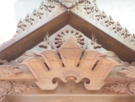 ธรรมจักรในดินแดนสุวรรณภูมิที่มีกวางหมอบอยู่ 2 ข้าง เป็นไม้แกะสลักอยู่ถัดขึ้นไปจากบานประตูไม้แกะสลักรูปเทวาทวารบาลจากประตูซุ้มทางเข้าอุโบสถ (สิม) วัดคามวาสี บ้านโพน อำเภอท่าอุเทน จังหวัดนครพนม เป็นสัญลักษณ์ที่หมายถึงการประกาศสัจธรรมอันสำคัญที่เรียกว่า ธัมมจักกัปปวัตนสูตร คือ อริยสัจ 4 มรรค (ทางสายกลาง) ที่หมายความต่อไปยังแนวประพฤติปฏิบัติเพื่อความหลุดพ้น 8 ประการ หนทางของการดำรงชีวิต ศรัทธา และปฏิบัติที่จะต้องไม่บำเรอตนให้เพลิดเพลินด้วยกามคุณทั้ง 5 และไม่ทรมานตนให้ ถัดขึ้นไปด้านบนจากสัญลักษณ์วงล้อธรรมจักรและกวางมอบอยู่ 2 ข้าง จะสังเกตเห็นเป็นการแกะสลักไม้เป็นภาพ หน้ากาลอยู่เหนือประตูทางเข้าอุโบสถ มีนัยว่าเพื่อปกป้องรักษาอุโบสถ (สิม) วัดคามวาสี และมอบพลังอำนวยอวยพรให้แก่ผู้ที่เข้ามาภายในวัดคามวาสี
