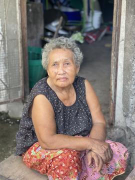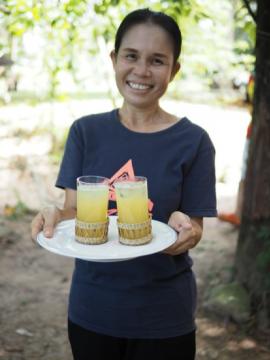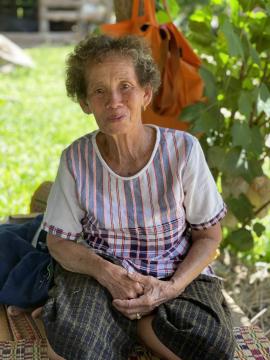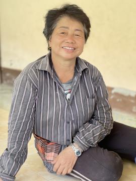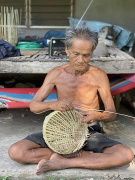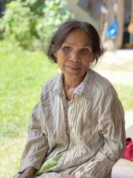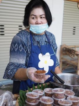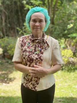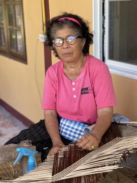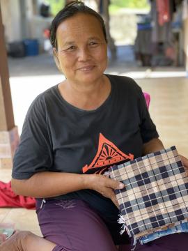 นางบัวผัน กิติศรีวรพันธุ์ ปราชญ์ชุมชนด้านการย้อมผ้ามัดหมี่สาธิตวิธีการมัดย้อมและแปรรูปเสื้อจากผ้ามัดหมี่ ในหมู่บ้านชนเผ่าไทญ้อบ้านโพน ตำบลโนนตาล อำเภอท่าอุเทน จังหวัดนครพนม และเป็นสมาชิกกลุ่มทอผ้ามัดหมี่