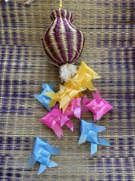 โมบายรูปข้องและปลาตะเพียน เป็นผลิตภัณฑ์ของฝากของที่ระลึกของชุมชนไทญ้อบ้านโพนโดยมีการออกแบบและสร้างสรรค์ผลิตภัณฑ์ โดยนำต้นกกพันธุ์น้ำจืด (กกกลม) ที่มีอยู่ในชุมชนบ้านโพน มาใช้ในการสานมีรูปลักษณ์เป็นข้อ