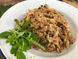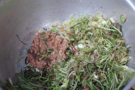 คั่วหน่อไม้ส้ม(หน่อไม้ดอง) ใช้วิธีการรวนหมูหรือเนื้อสัตว์ชนิดอื่นกับหน่อไม้ส้ม ใส่พริกแกงเผ็ด ปรุงรสด้วยน้ำปลา และข้าวเบือเล็กน้อย ใส่ใบมะกรูดและกระเพราเพิ่มความหอม