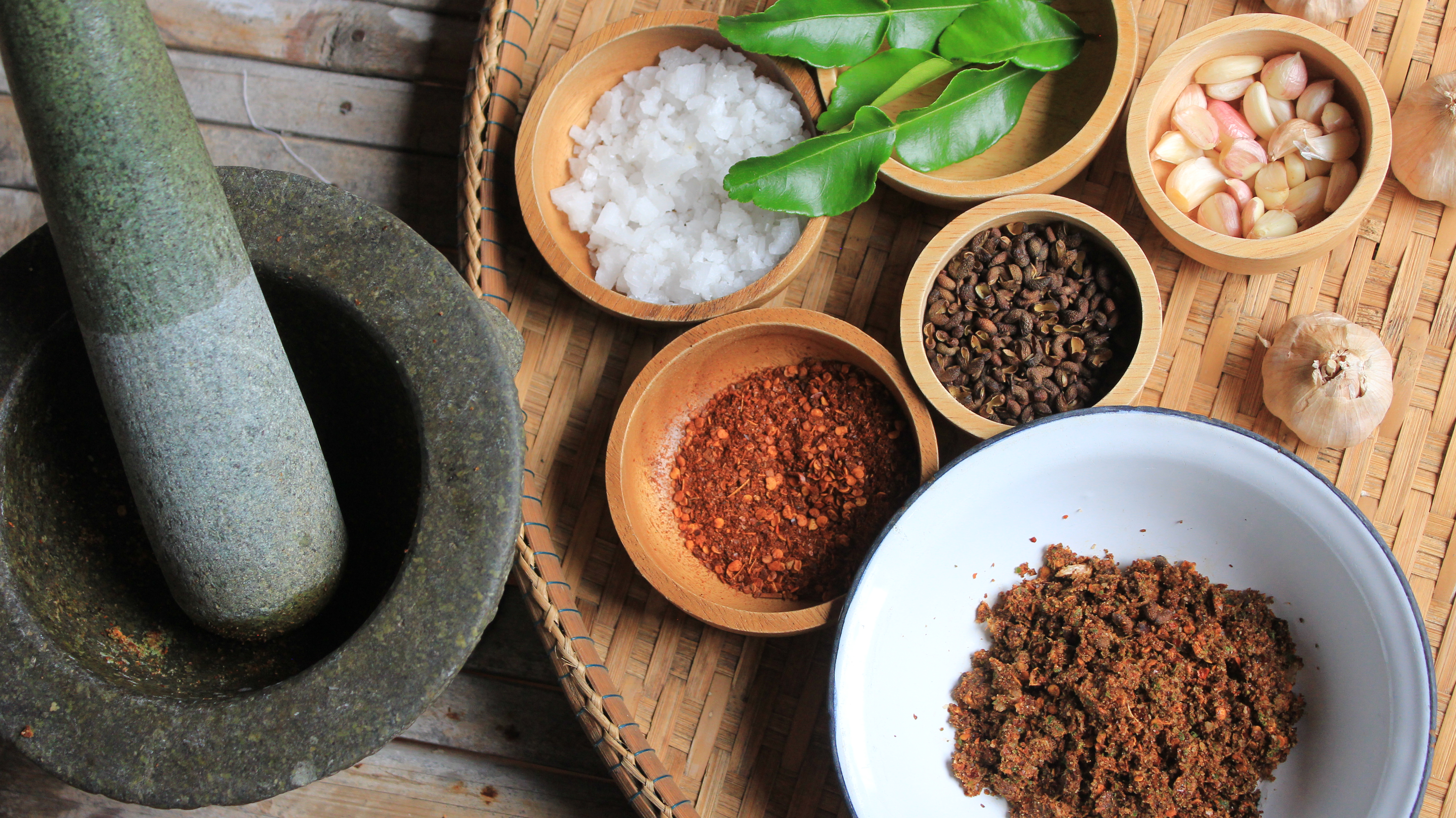 ภาพพริกตะเกลือที่ตำเสร็จแล้วในถ้วยสีขาว และส่วนผสมของพริกตะเกลือทั้ง 5 อย่าง (พริกป่น เกลือ ใบมะกรูด กระเทียม และกำจัด)