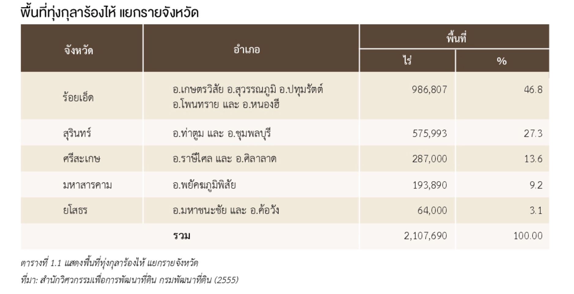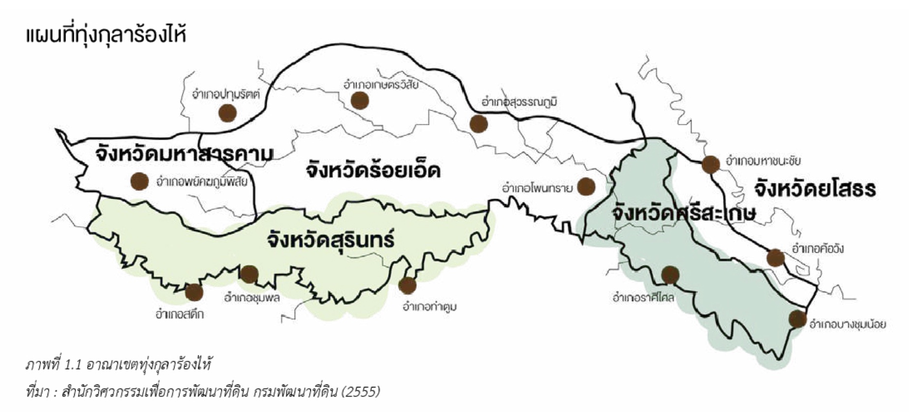 ทุ่งกุลาร้องไห้เป็นที่ราบขนาดใหญ่ ตั้งอยู่ทางทิศตะวันออกเฉียงใต้ของที่ราบสูงโคราชในพื้นที่ภาคตะวันออกเฉียงเหนือของประเทศไทย มีพื้นที่ประมาณ 2.1 ล้านไร่ มีอาณาบริเวณครอบคลุมพื้นที่ 51 ตำบล 12 อำเภอ ใน 5 จังหวัด คือจังหวัดร้อยเอ็ด จังหวัดศรีสะเกษ จังหวัดยโสธร จังหวัดสุรินทร์ และจังหวัดมหาสารคาม