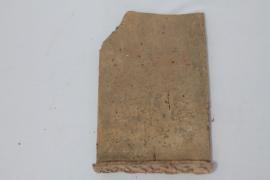 มีลักษณะเป็นแผ่นสี่แหล่มปลายตัดตรง ตรงปลายด้านใดด้านหนึ่งทำเป็นขอเพื่อติดกับกระเบื้องอีกแผ่นในการใชมุมหลังคา และตรงปลายส่วนด้านหน้าที่ทำเป็นขอก็ประดับตกแต่งลวดลายด้วยดอกไม้ล้านนา มีร่องรอยชำรุดแตกหักเหลือเพียงครึ่งเดียว และตรงขอแตกหักเล็กน้อย