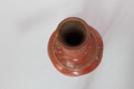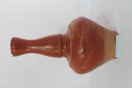 ทำมาจากดินเผาแต่เคลือบไม่หมด สีแดงน้ำตาล มีร่องรอยชำรุดตรงบริเวณปาก