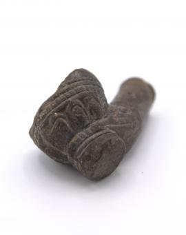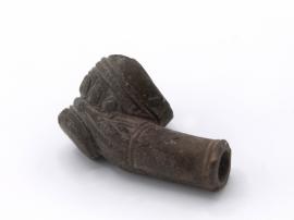 ขนาด : ส. 2.8 ซม. ย. 5.9 ซม. ฐก. 1.0 ซม. ปก. 2.1 ซม. / ลักษณะทางกายภาพ : มีลักษณะเป็นท่อยาวมีหลุมเล็กๆ สำหรับใส่ยาสูบ ตรงปากบนแตกหัก มีลวดลายเป็นกลีบดอกบัวรอบตัวปากกล้อง และลายขูดขีดเป็นเส้นรอบๆ