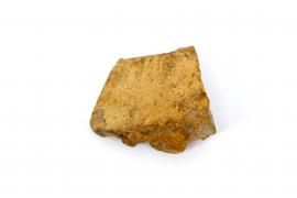 ขนาด : ส. 0.5 ซม. ก. 1.3 ซม. ย. 5.5 ซม. / ลักษณะทางกายภาพ : ลักษณะเป็นชิ้นส่วนของพระพิมพ์ซึ่งทำจากดินเผา ไม่ทราบปาง เนื่องจากชิ้นส่วนที่เหลืออยู่เห็นเป็นพระวรกายด้านบนเพียงเล็กน้อยส่วนที่เหลือได้แตกหักออกไป