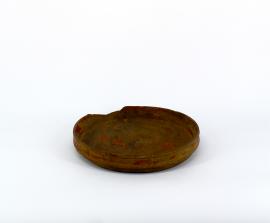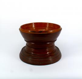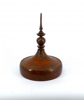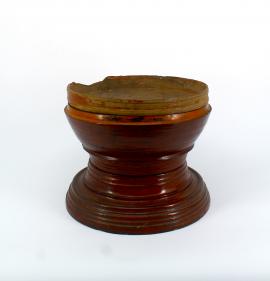 ขนาด : สฝ. 45.5 ซม. กฝ. 36.0 ซม. สฐ. 26.0 ซม. กฐ. 29.0 ซม. ส. 71.5 ซม. / ลักษณะทางกายภาพ : มีการแบ่งแยกชิ้นส่วนเป็น 2 ส่วน คือ ฝาปิด และฐาน มีการลงรักหาง (ชาด) ส่วนฝามีการแกะสลักลดหลั่นกันขึ้นไปจนถึงปลายยอด ส่วนฐานมีการแกะสลักลดหลั่นกันลงมาจนถึงฐานตั้งแล้วกว้างออก มีร่องรอยชำรุดหักบิ่นออกบางส่วนบริเวณปากฐาน
